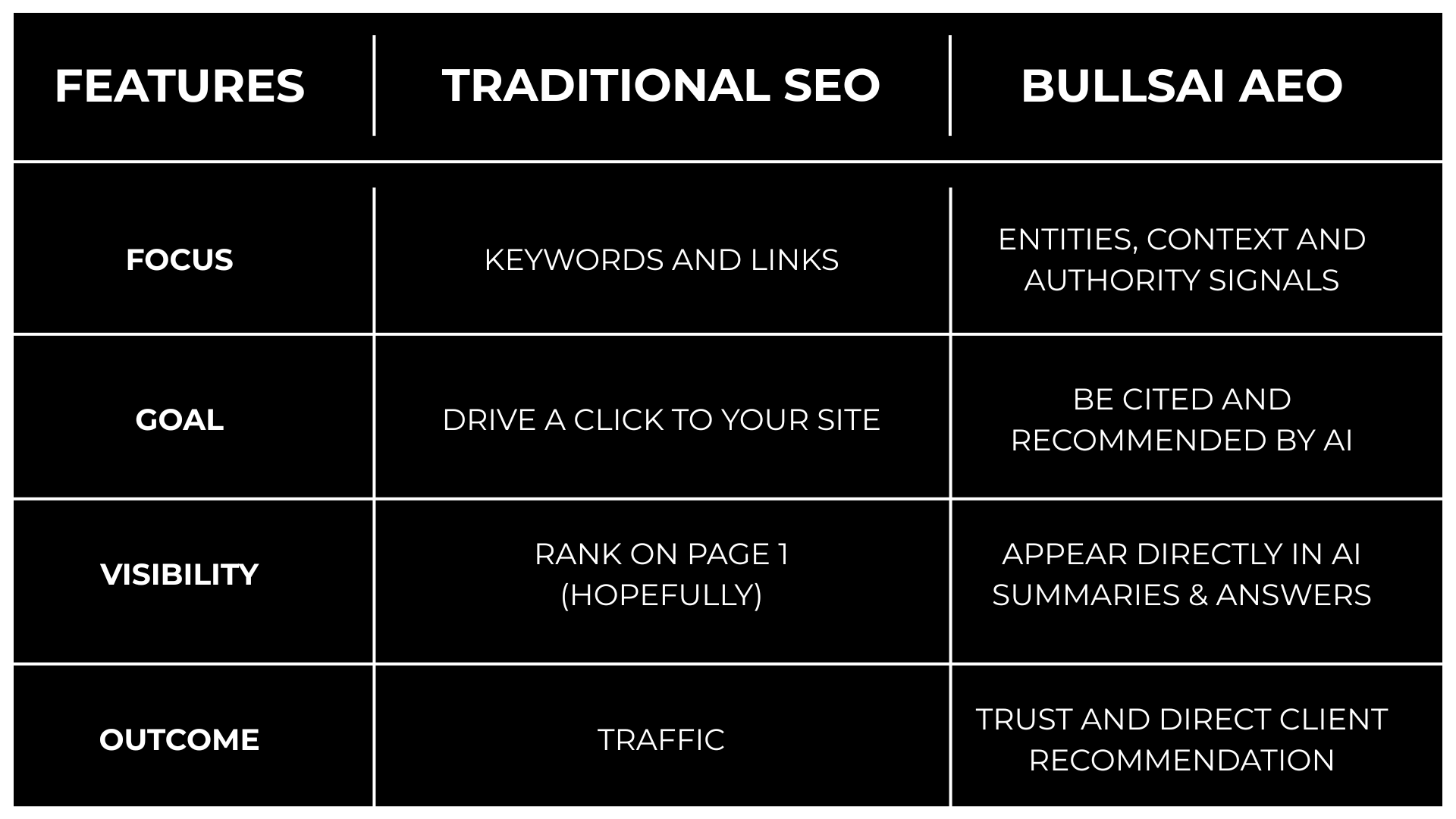 AEO is not replacing SEO; it's maximizing it. We move beyond simply being "searchable" to being instantly "credible" in the eyes of the AI.